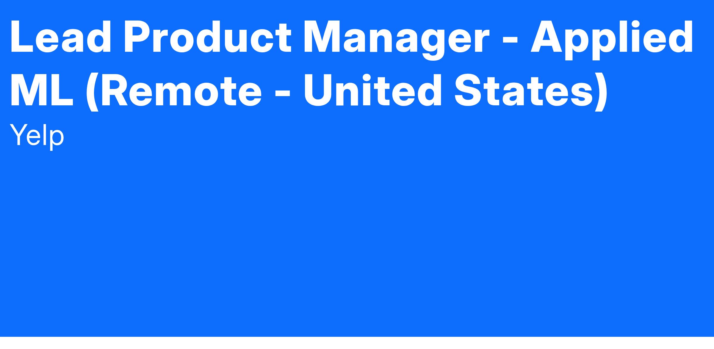 We are looking for a seasoned product manager (Senior or Lead PM) to join the Applied Machine Learning Product team at Yelp. This team works horizontally with a broad set of stakeholders and has an ambitious charter to accelerate AI/ML-driven outcomes across the company. In this role, you will operate across a range of vertical problem spaces, deeply understand priorities for these areas, identify the right opportunities for the introduction of AI/ML, and drive product initiatives through the life cycle.
