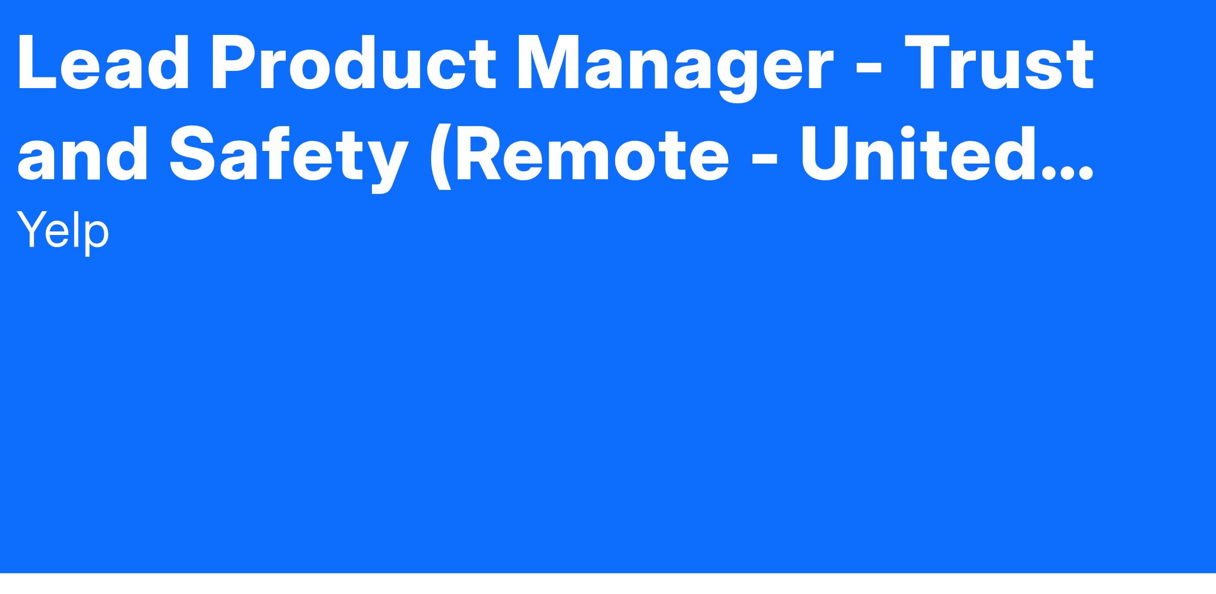 Yelp’s Trust & Safety team is seeking a Lead Product Manager to drive core efforts for our Review Recommendation System and global compliance initiatives. You’ll play a critical role in shaping Yelp’s defenses against fake reviews and deceptive behavior, while also serving as the product lead for our evolving global compliance efforts. You’ll work closely with engineering, data science, legal, and operations to ensure Yelp remains a trusted platform for millions of users.
