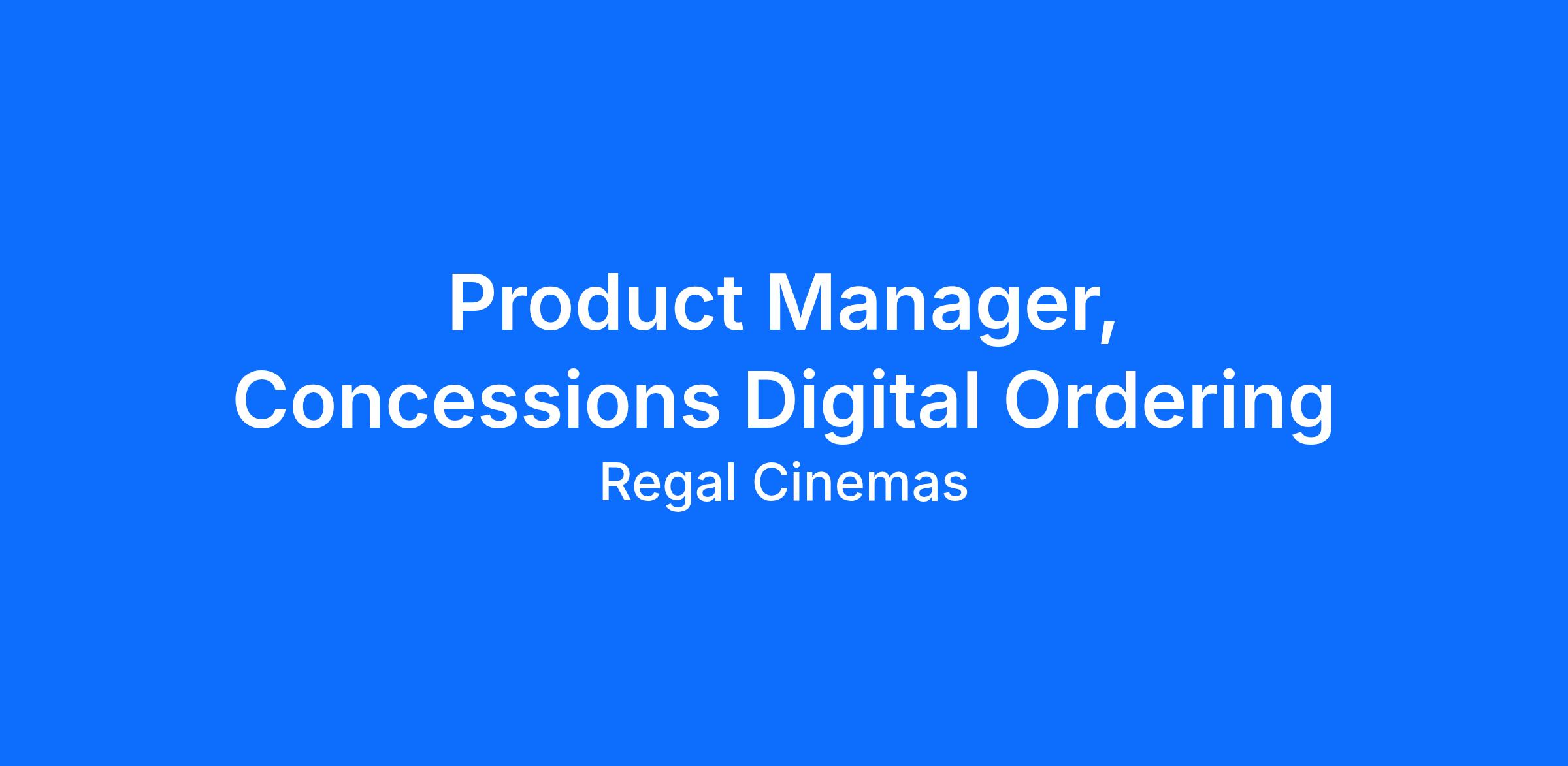 Regal Cinemas is seeking a Product Manager to lead the Concessions Digital Ordering experience across web, iOS, Android, Kiosk, and POS. This role owns both the standalone food and beverage ordering journey and the flow integrated into movie ticket purchase. You’ll improve how guests browse, order, and pick up concessions—making the process faster, easier, and more delightful from digital selection to inâtheater pickup.