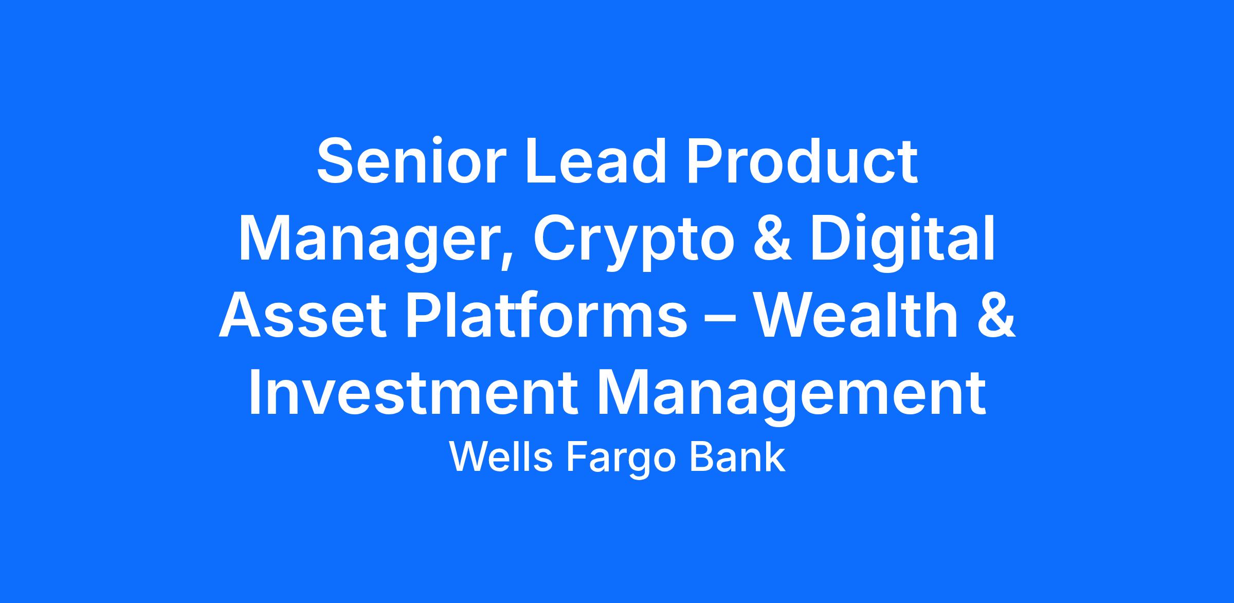 Wells Fargo is seeking a Senior Lead Product Manager, Crypto Platforms to join the Wealth & Investment Management (WIM) Chief Product Office within the newly formed AI & Digital Asset Platforms team. This role will drive cross‑product crypto portfolio management and strategy, leading the modernization, governance, and execution of Wells Fargo’s crypto product capabilities in a highly regulated and rapidly evolving market environment.