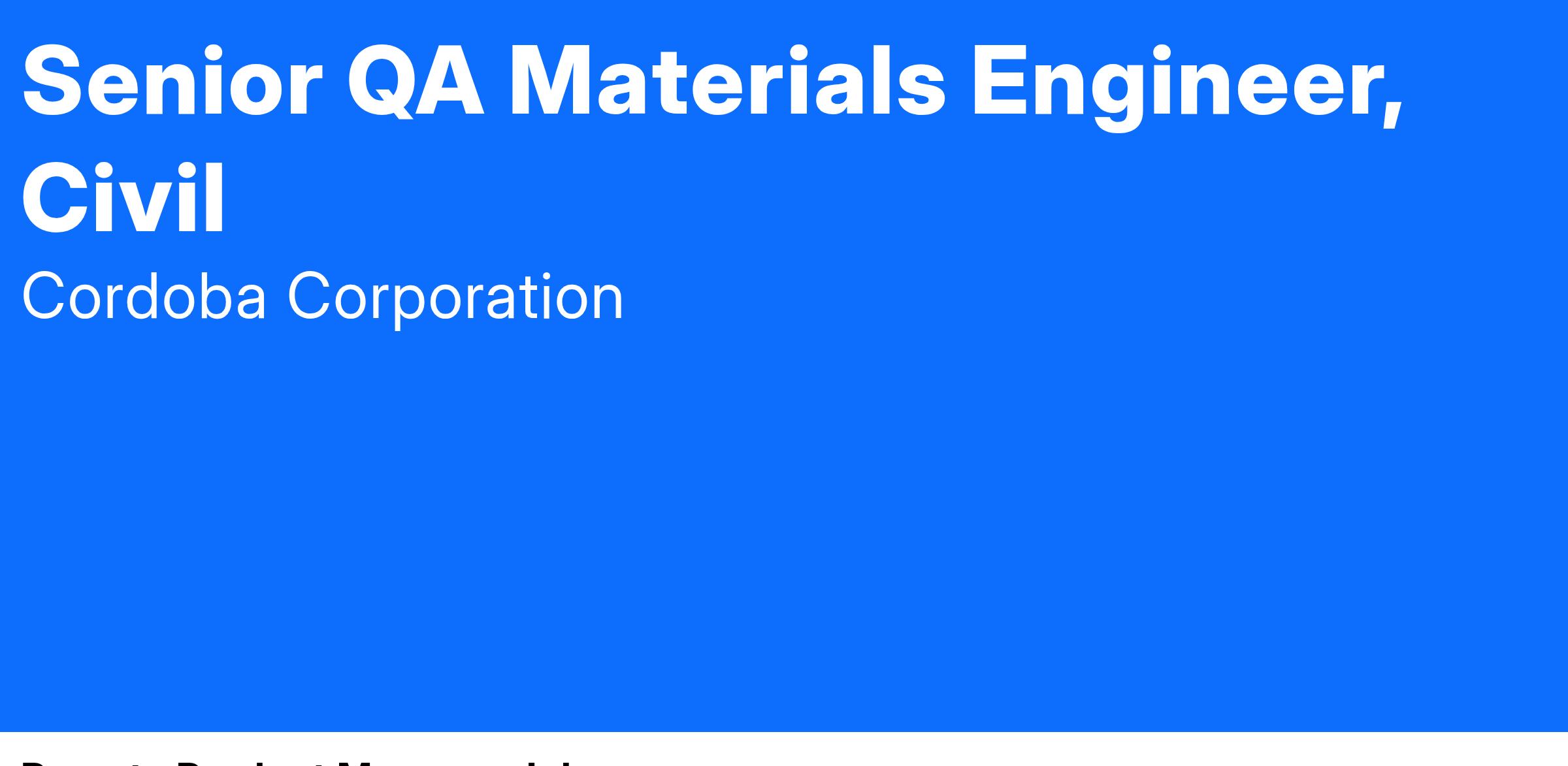 Cordoba Corporation, a leading engineering firm in CA, is hiring QA Materials Engineers transportation project, working in materials engineering and testing services. This role will be responsible for ensuring the quality and compliance of materials used in transportation infrastructure projects. This role involves rigorous inspection, testing, and documentation to meet standards and federal regulations.
