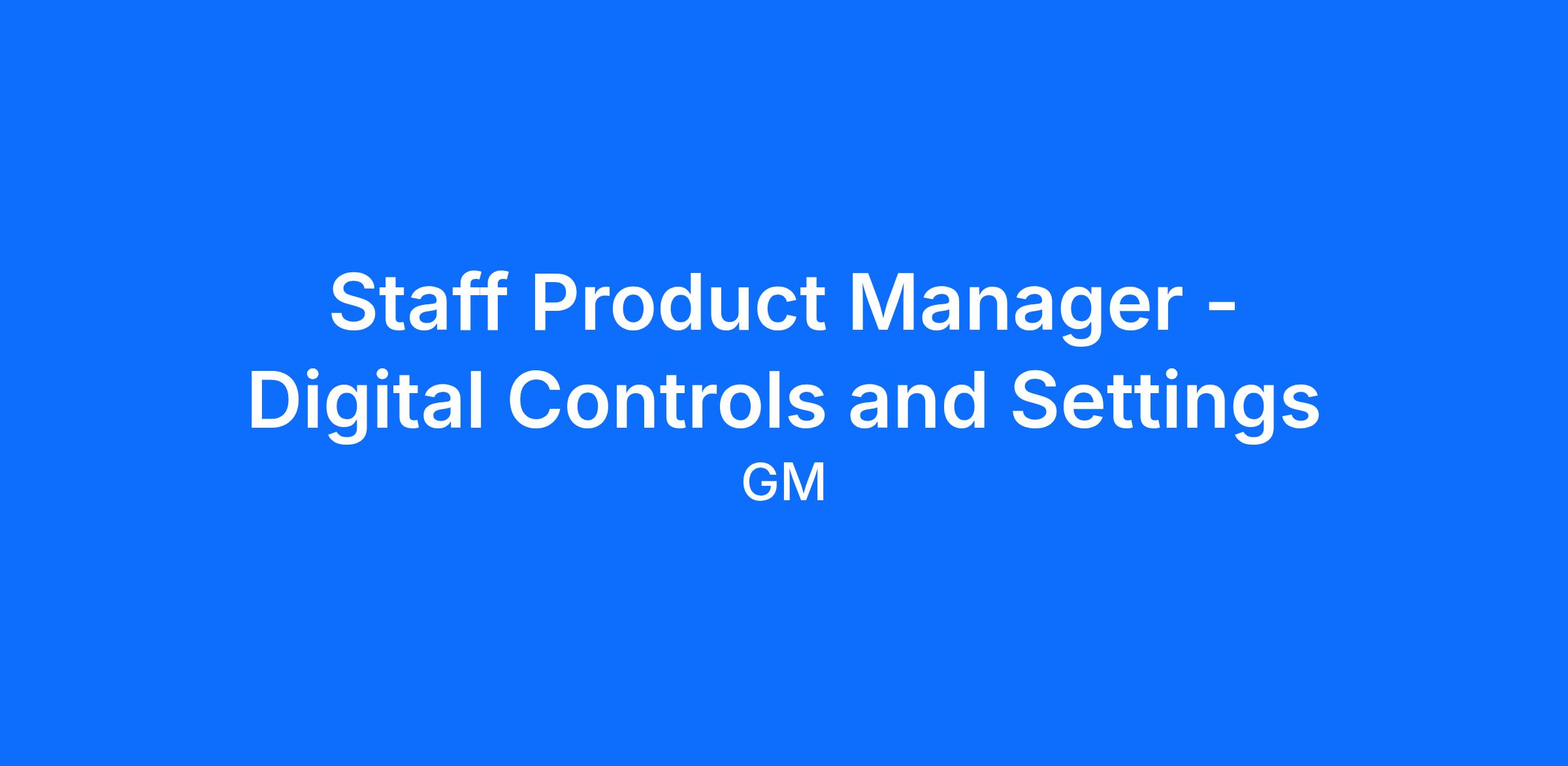 As Staff Product Manager – Vehicle Controls & Settings, you will lead the strategy and execution for GM’s unified digital control and vehicle settings experiences. This role spans the entire domain of controls (immediate, action‑oriented interactions) and settings (persistent, personalized configuration), shaping how customers understand, interact with, and customize their vehicles.
